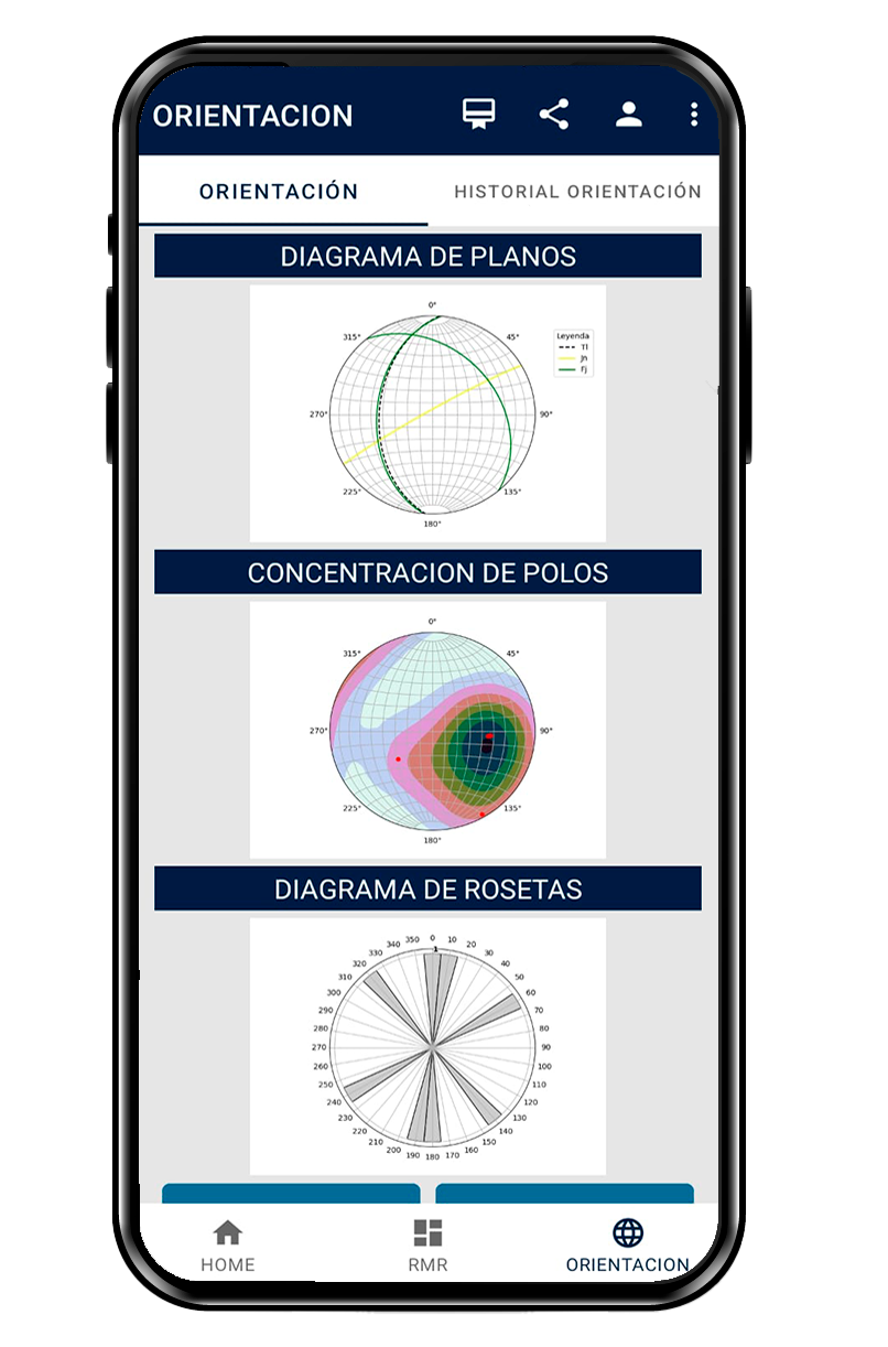 Permite ingresar valores de Rumbo y Buzamiento del frente de estudio con el objetivo de obtener proyecciones estereográficas (Diagrama de Planos, Concentración de polos y Diagrama de Roseta)