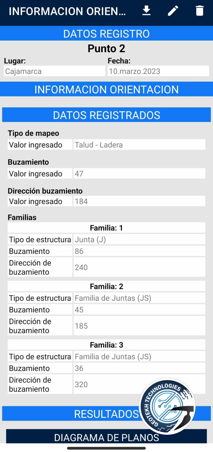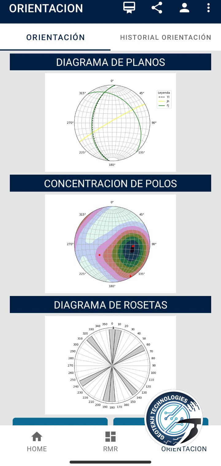 El segundo módulo “Estereografía” funciona ingresando datos de rumbo y buzamiento de las estructuras identificadas en la celda o área de estudio, de forma que al procesar esta data, se genera las respectivas proyecciones estereográficas (Diagrama de planos, Concentración de polos y Diagrama de Roseta)