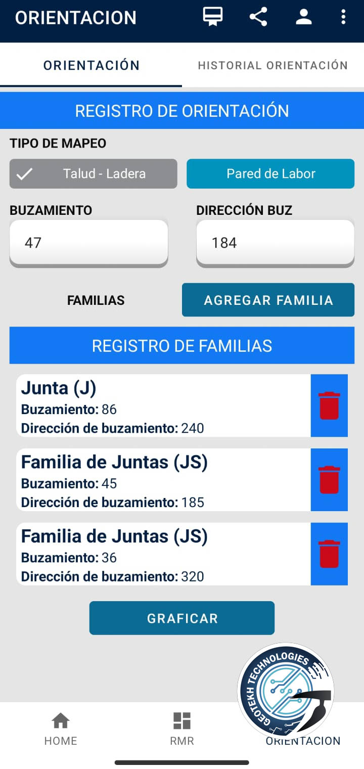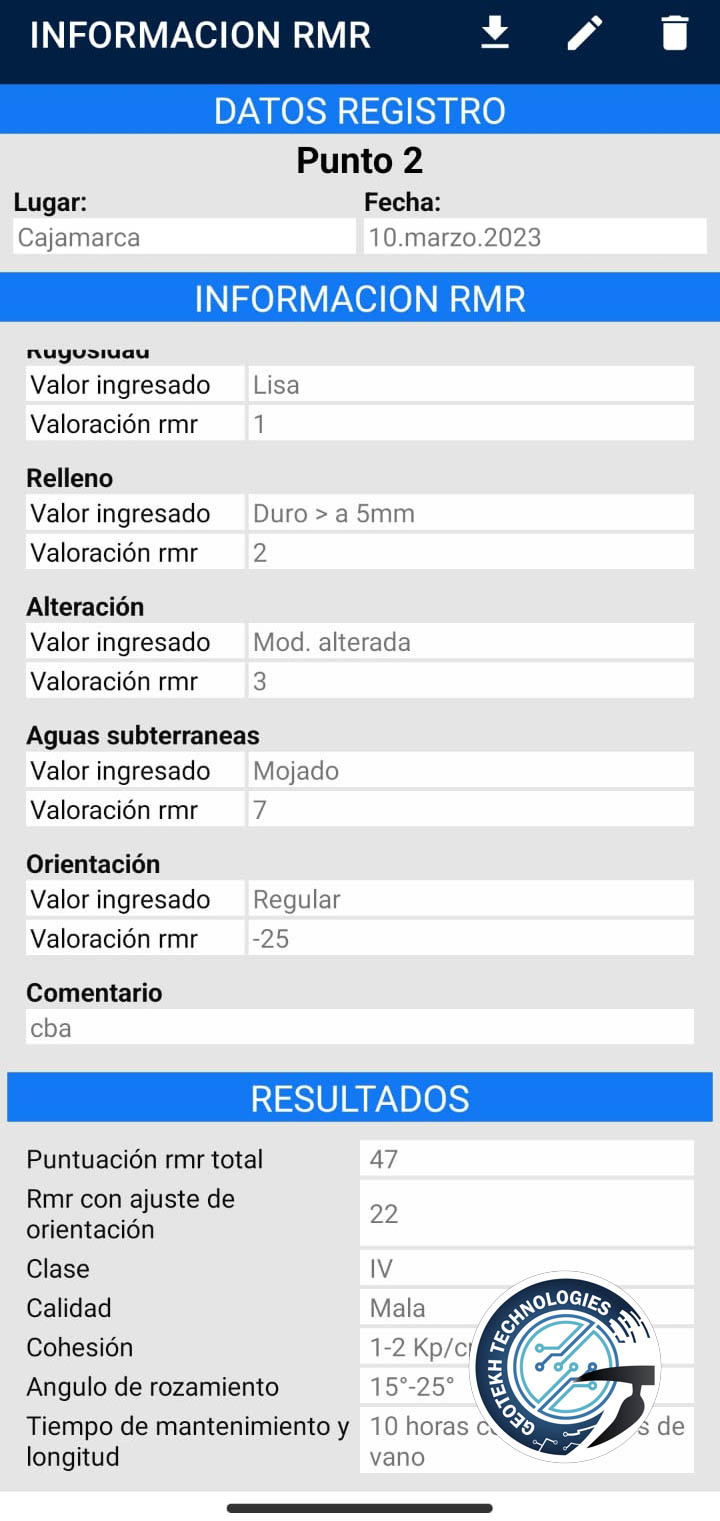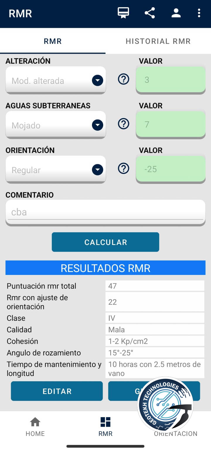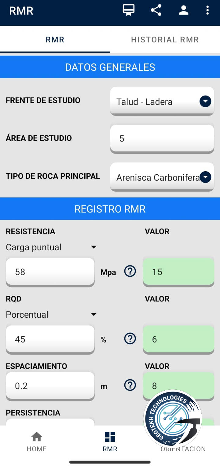 Registra las características geomecánicas de la roca según los parámetros RMR de Bieniawki manualmente. Adicionalmente cuenta con ayudas para un llenado más rápido